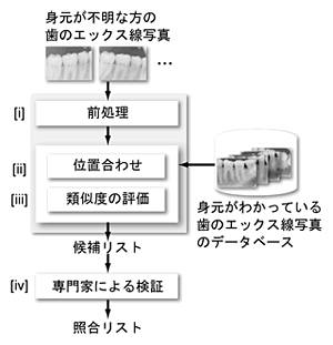 の4ステップで構成されています。ステップ〔i〕から〔iii〕までは、コンピュータを使って自動的に処理が行われ、データベース内から候補となる歯のエックス線写真のリストを作成します。ステップ〔iv〕は、専門家が検視時の画像(入力画像)と候補となる画像(ステップ〔i〕から〔iii〕で作成されたリスト)とを照合します。身元確認は間違いの許されない正確な照合が求められますので、最終的な判断は専門家が行います。