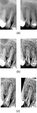 歯のエックス線写真は、撮影のタイミングによりエックス線照射量が異なるため、ぼけてしまうことが多いです。診療には問題ありませんが、コンピュータで処理をするときには、このようなぼけにより画像処理の精度が下がってしまいます。そこで、前処理として画像のコントラストを強調します。図2の(b)がコントラスを強調した例になります。