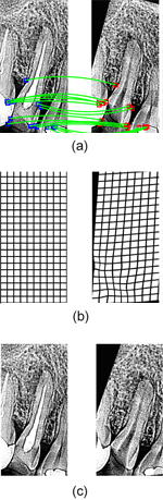 【図3】歯のエックス線写真のひずみ補正: (a)左の画像にある基準点に対応する点を右の画像から求めた結果 (b)得られた対応関係より作成したひずみモデル (c)ひずみ補正後の画像