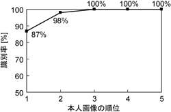 図6は実験結果をまとめたグラフになります。横軸は本人画像の順位、縦軸は識別率を示しています。たとえば、照合スコアが1番高かったものには、本人画像が87%含まれています。また、上位3番で識別率が100%になっていることより、候補リストの上位3番目までに必ず本人の画像が含まれていることがわかります。この結果より、専門家は、候補リストにある上位3番までの画像を照合すればいいことになります。システムを利用しなかった場合、専門家は3,600回の照合をしなければなりませんが、システムを利用することで、そのうちの5%を照合するだけでよいことになります。本システムが実用化されれば、身元確認における専門家の作業負担を大幅に削減するとともに、結果が出るまでの時間の短縮や、照合精度の向上も期待されます。