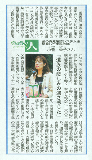 父親にあこがれ歯医者になった。今は父親が院長を務める群馬県高崎市の歯科医院に勤務する。検視警察医としても働く父親の姿を見て、システムの開発を思い立った。「それから10年。日航ジャンボ機墜落事故の遺族が背中を押してくれた」