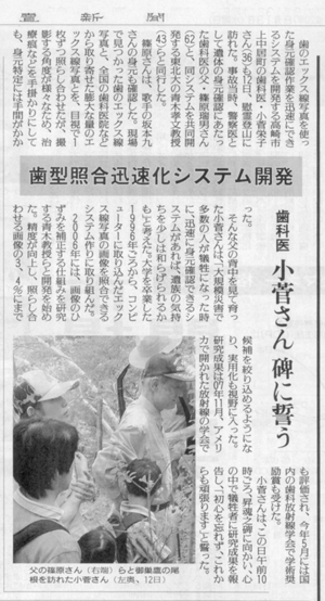 歯のエックス線写真を使った身元確認作業を迅速にできるシステムを開発する高崎市上中居町の歯科医・小菅栄子さん(36)も12日、慰霊登山に訪れた。事故当時、警察医として遺体の身元確認にあたった歯科医の父・篠原瑞男さん(62)と、同システムを共同開発する東北大の青木孝文教授(43)らと同行した。