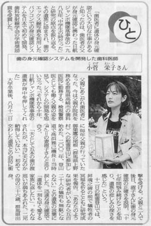 新聞各紙に当院の小菅栄子らが開発中の「大規模災害時における歯のX線写真を利用 した身元確認システム」について、日航機墜落事故の慰霊登山についての記事が西日本新聞に掲載されました。