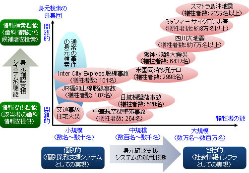 最近では,阪神・淡路大震災(犠牲者6,437人)、スマトラ島沖地震(犠牲者22万人以上)、四川大地震(犠牲者7万人以上)、米国同時多発テロ(犠牲者2,998人)など、桁違いに大規模な災害・事故・事件が頻発しています(図1)。また、現在、発災が危惧されている東海・南海・東南海連動型地震においても、2万人以上の犠牲者が予想されています。万が一の緊急事態に、私たちの社会を『身元不明社会』にしないために、遺体の大量検視の問題をタブー視することなく、自治体・警察・医師・歯科医師が一体となって抜本的な対策を打ち出す必要があるのではないでしょうか。