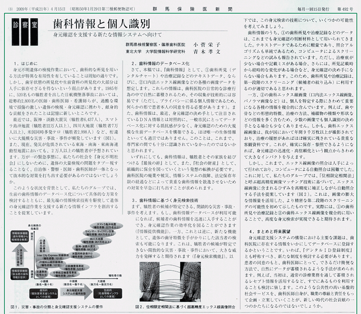 このような状況を背景として、私たちのグループでは、生前の歯科情報のデータベース化について具体的な方策を検討するとともに、最先端の情報検索技術を駆使して遺体の身元確認作業を支援する新たな情報インフラを創出することを提案しています。