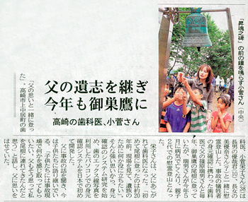 高崎市上中居町の歯科医、小菅栄子さん(38)は、長男の優哉君(10)、長女の美優奈さん(7)と一緒に慰霊登山した。事故の犠牲者の身元確認に携わった歯科医で父の篠原瑞男さんと毎年、御巣鷹の尾根に登っていたが、瑞男さんが今年5月に病気で亡くなり、親子2代での慰霊登山となった。