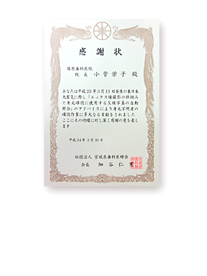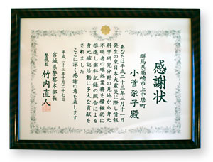 当院の小菅栄子が、宮城県警本部長(23年10月27日)、高崎警察署長(24年1月20日)、宮城県歯科医師会(24年3月30日)それぞれ感謝状をいただきました。