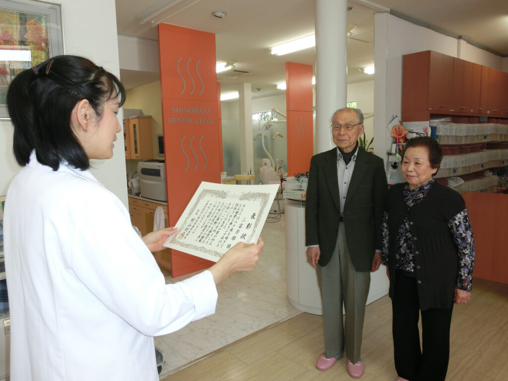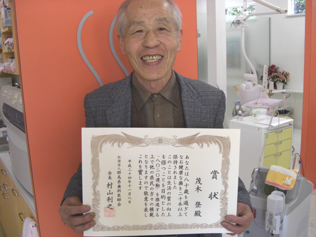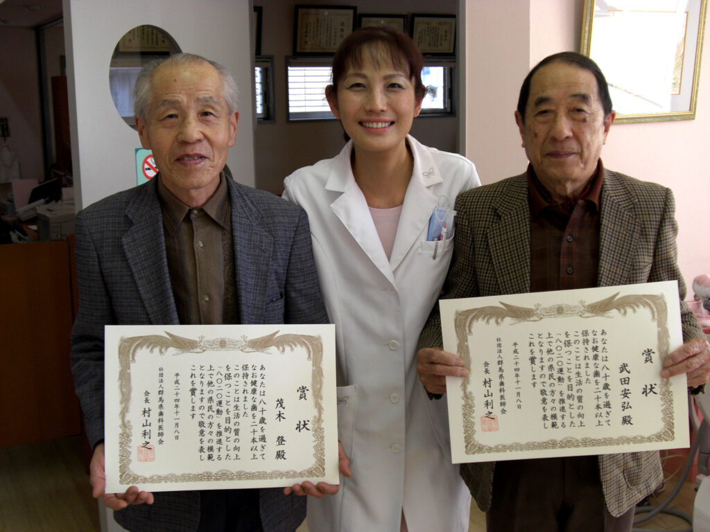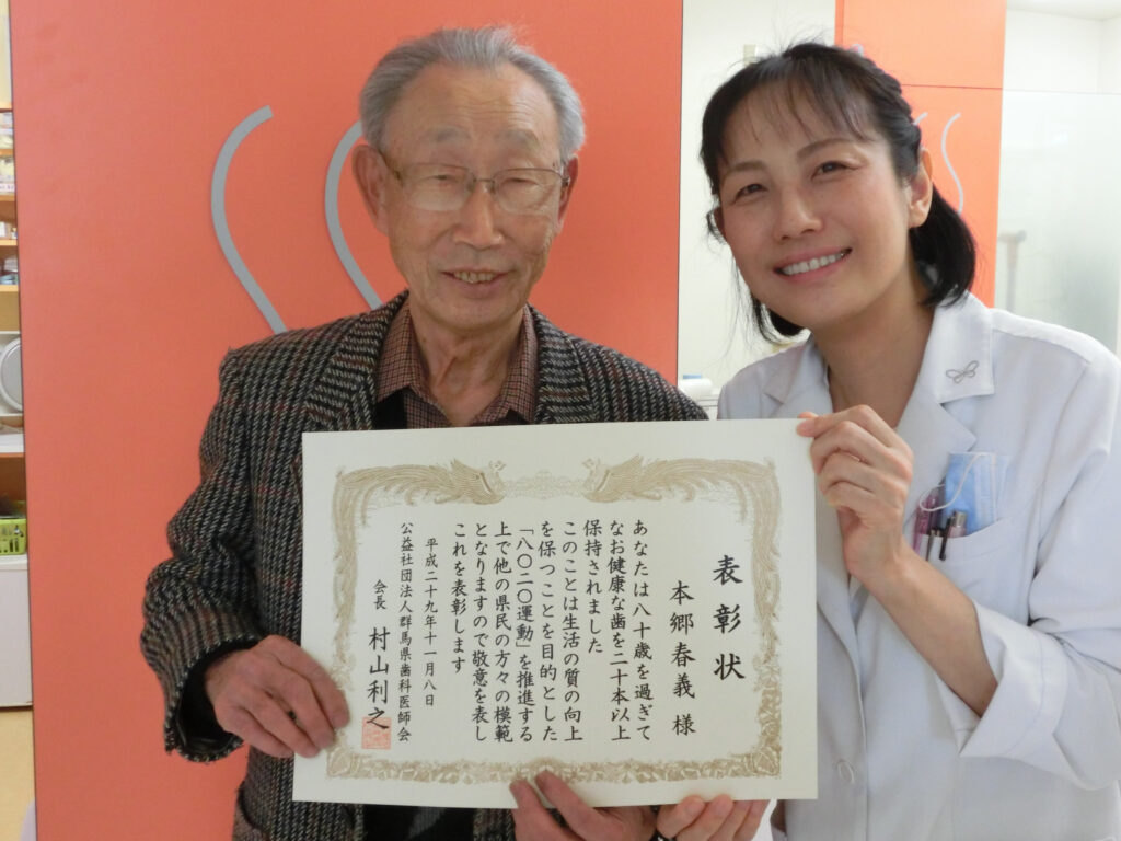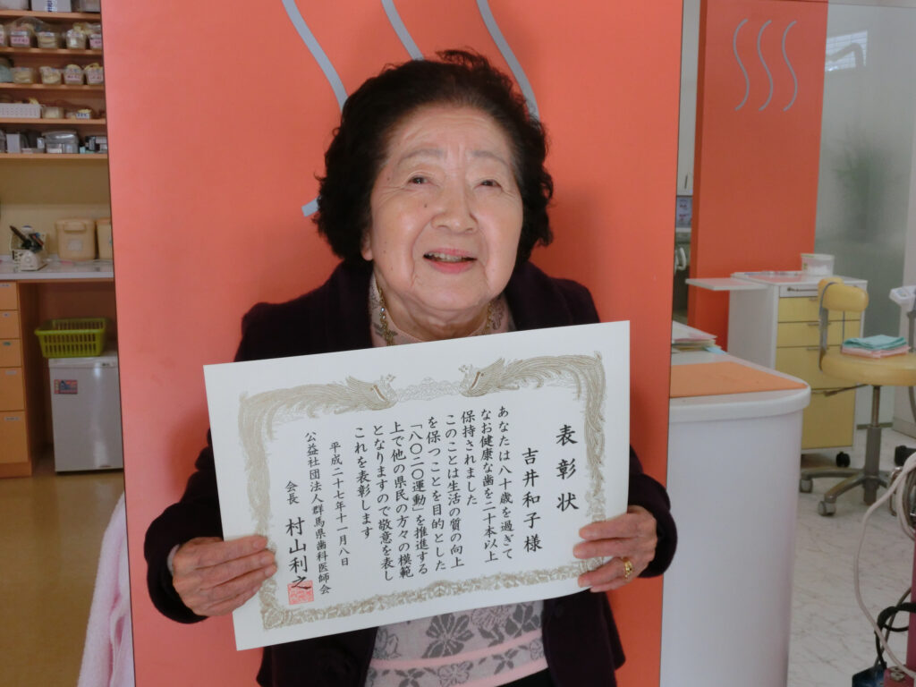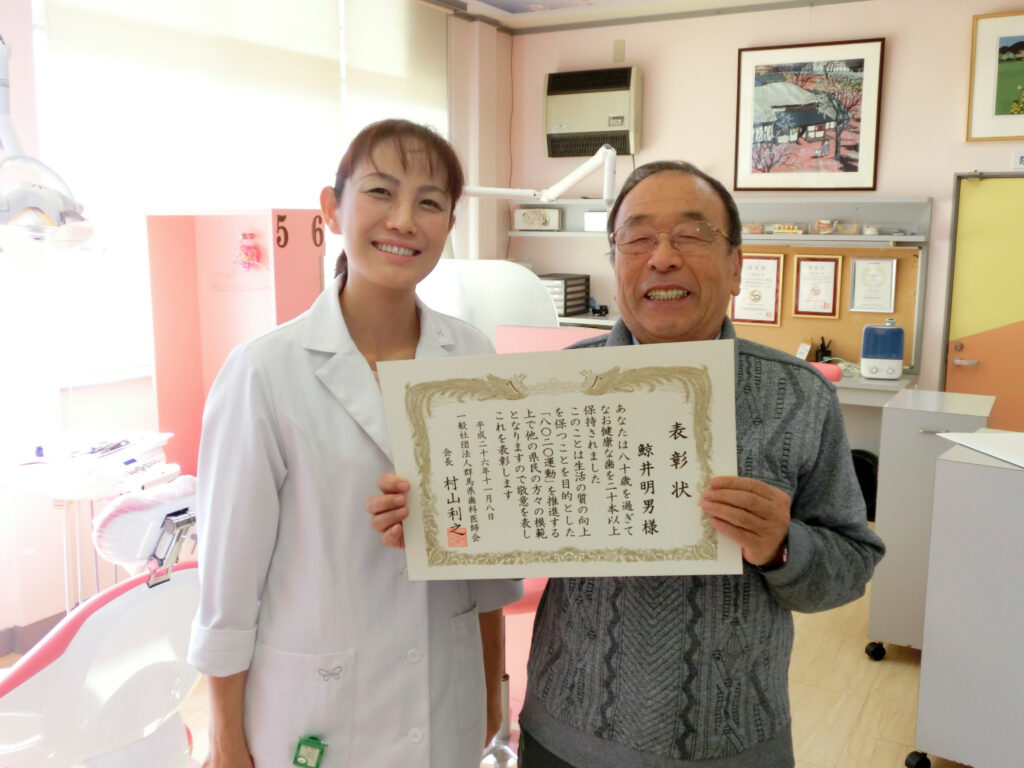 80歳以上で20本以上の歯を残された方を、篠原歯科医院から群馬県歯科医師会に推薦して、8020運動の表彰状を頂いてます。